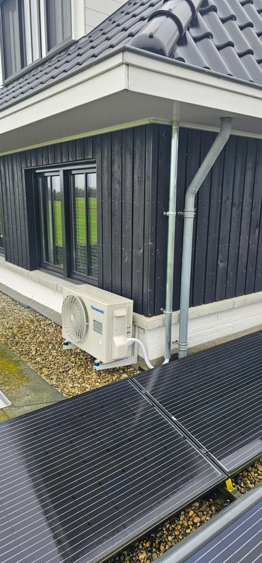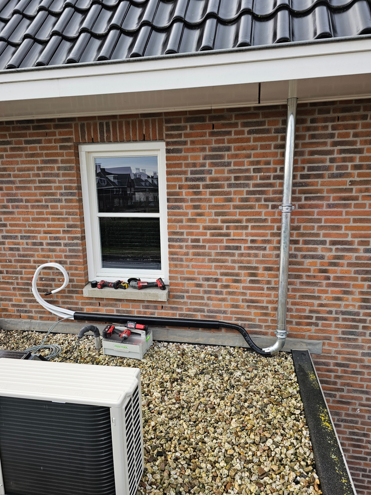 In plaats van standaard witte kabelgoten, kiezen wij liever voor visueel aantrekkelijke oplossingen. Hier ziet u hoe wij het leidingwerk van een warmtepomp volledig hebben geïntegreerd in een zinken regenafvoer-stijl. Onzichtbaar voor het oog, perfect voor de uitstraling van uw woning.
